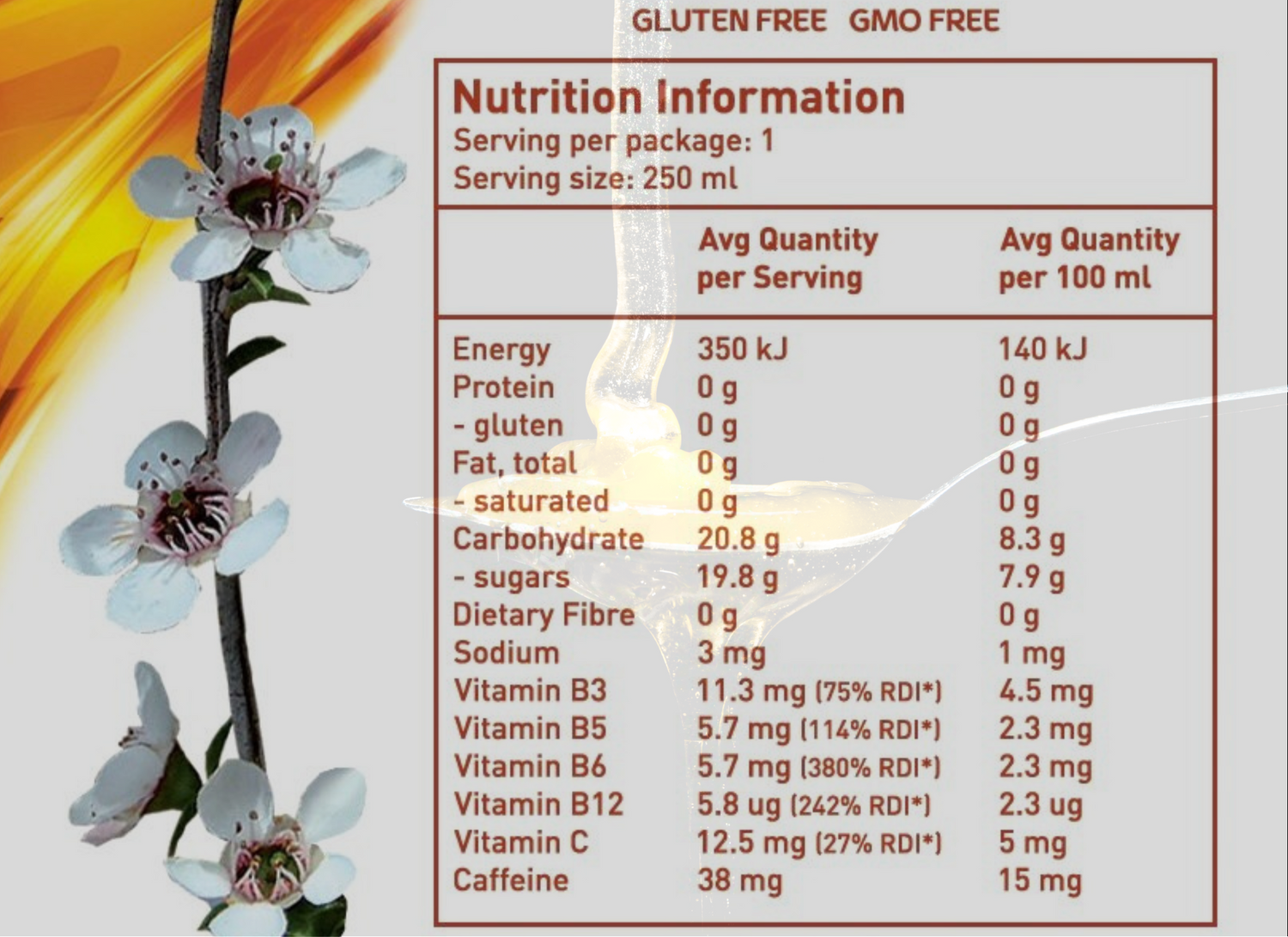 Carbonated Water, Avatar Monofloral MGO500+ Mānuka Honey (10%), Lemon Juice (from concentrate) (0.5%), Natural Flavourings, Vitamins (Vitamin C, Niacin [B3], Vitamin B5, Vitamin B6, Vitamin B12), Caffeine 38mg.